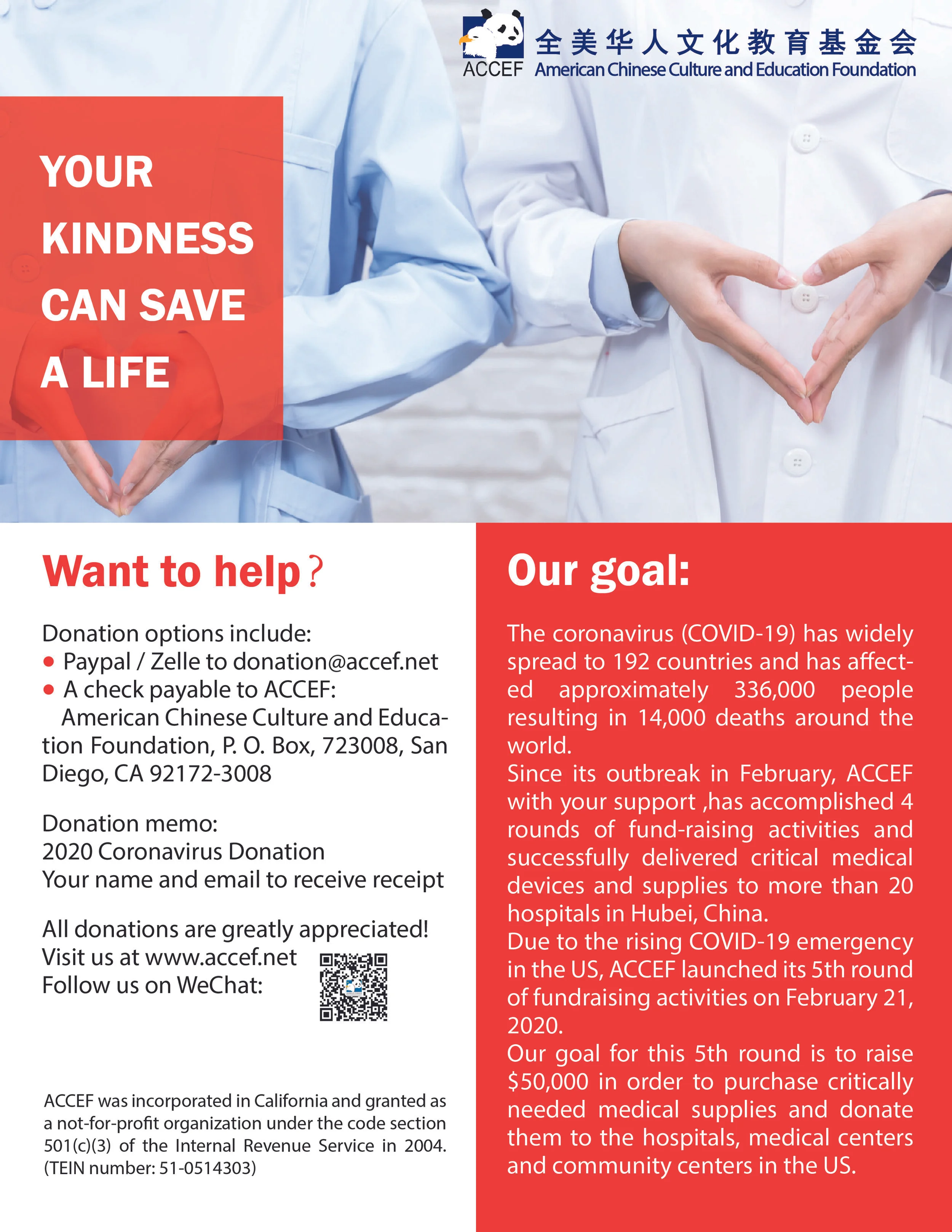 全美华人文化教育基金会(简称:ACCEF)抗击新冠捐款第五轮募捐:为社区,立足家园!大家共同努力。我们的目标:$ 5万美金,订购医院急需医护用品直送美国医院