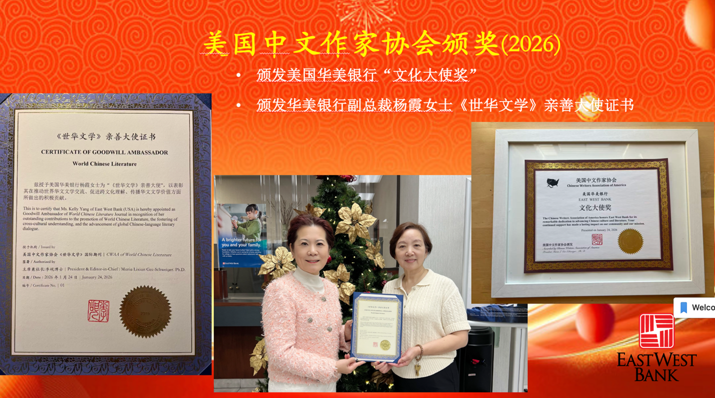 · 李岘主席为华美银行颁发了“文化大使奖” ,为华美银行副总裁杨霞颁发《世华文学》“亲善大使奖”,以表达美国中文作家协会对华美银行及副总裁杨霞女士对协会大力支持的谢意。