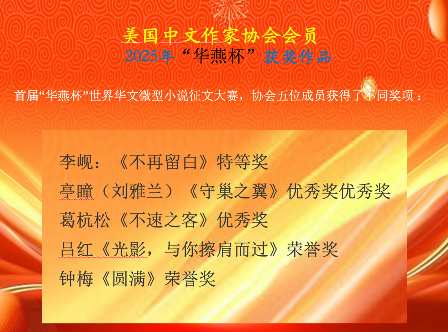 · 首届“华燕杯”世界华文微型小说征文大赛,美国中文作家协会有五位成员获得了不同奖项:李岘的《不再留白》获特等奖;亭瞳的《守巢之翼》、葛杭松的《不速之客》获优秀奖;吕红的《光影,与你擦肩而过》、 钟梅的《圆满》获荣誉奖。