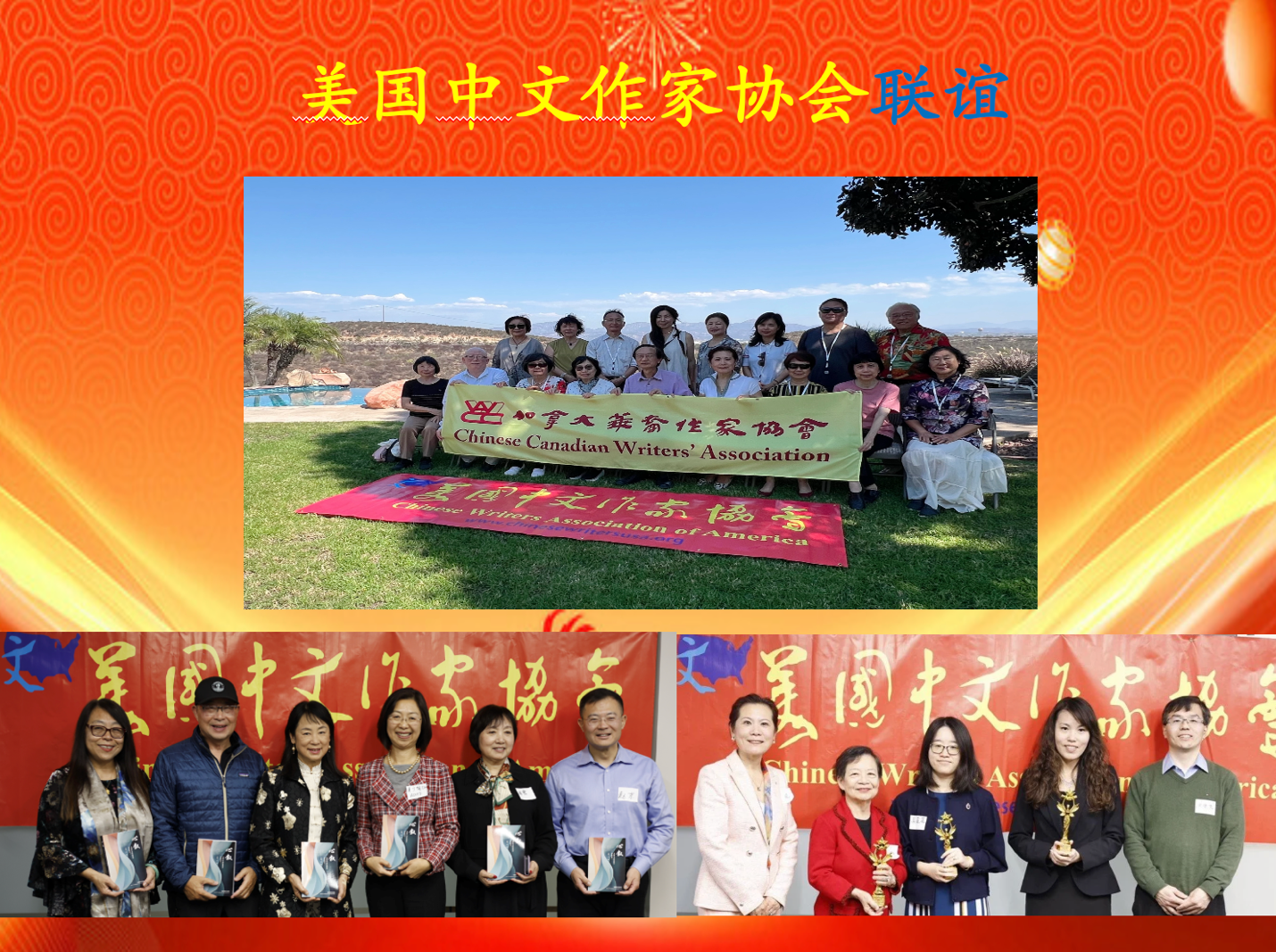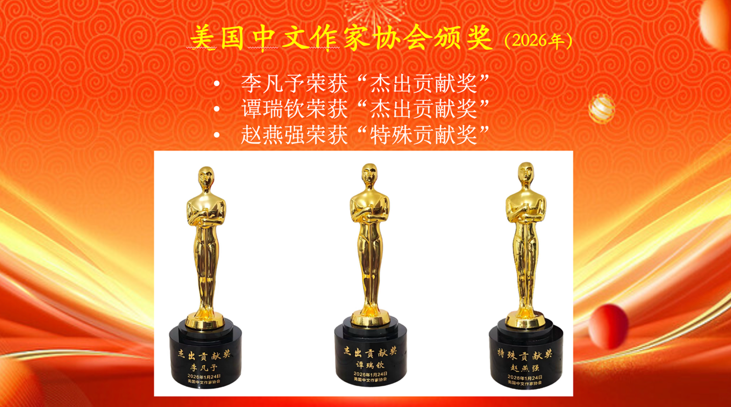 · 除上述两个奖项外,2025年协会成员获得各项文学奖的成员还有:袁瑞珍获奖报告文学《山海绝恋》获中国第六届石膏山文学奖.优秀奖。钟梅因主持美中作协微型小说论坛和征文,获“2025年世界微型小说十大新闻人物奖”。作协成员邱跃辉(青竹)获诗魂奖、获金笔诗人奖、获百强诗人奖称号、海外诗人,精英奖、获四海银桥奖、获十佳女诗人奖、获优秀作者奖。作协成员吕红《海风吹过海浪涌》等3篇获写作佳作奖;《马世云冲破政坛天花板》等3篇获报道文学佳作奖(海外华文著述奖)。作协成员刘雅兰(亭曈)《三颗跳动的小心脏》获得 “人间真情” 征文大赛优秀奖。作协成员符水仙散文《哥》荣获“人间真情”征文散文优秀奖。作协成员沈林沼(常照)《迷雾谷的试炼》第八届“金画眉”最佳剧本奖;《初登雷峰塔》获第二届“白鹭杯”金笔作家二等奖。李岘2025年初,荣获“世界华语微型小说研究会颁发的“2024年世界微型小说十大新闻人物奖”和美国国会议员Judy Chu博士颁发的“杰出贡献奖”。