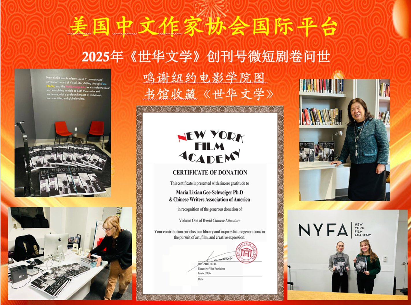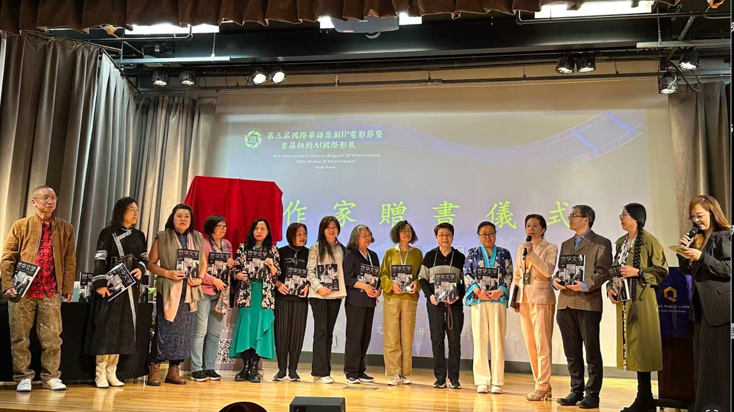 2025年是协会成立十周年。协会创办国际期刊《世华文学》,历经一年筹备,从酝酿评估到出版首发,并借华语IP电影节之势在纽约法拉盛图书馆举办隆重首发式,现场近百人参加。随后,李岘主席自费去中国参加两项世界华文文学研讨会,继续推动《世华文学》。她向参会的专家学者及多国文学团体的负责人赠送了期刊,为后续跨洲合作组稿奠定了基础。《世华文学》邀请到25位世界华文文学研究领域专家学者做顾问或参与出版工作,截止到目前,美国国会图书馆及众多的美国和中国大学图书馆都收藏了《世华文学》。日前,纽约电影学院图书馆不仅收藏《世华文学》,并将作为教材赠送华人师生。