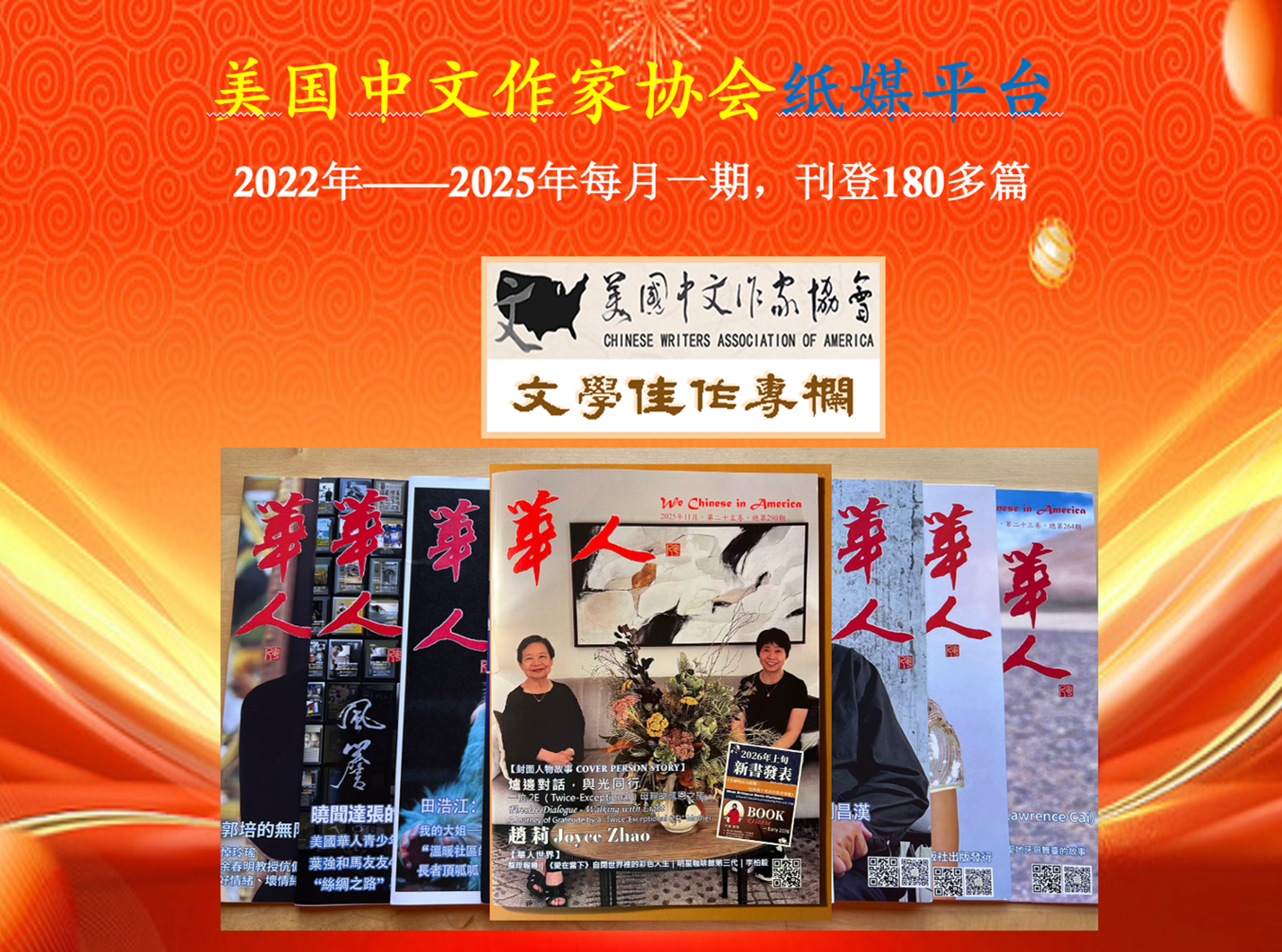自2022年起,美国圣地亚哥《华人》月刊为协会开办“文学佳作专栏”,每月从协会“每月集锦”中精选3—4篇作品刊登,为会员提供稳定纸媒展示平台。仅2025年就刊登了42篇不同文体的文学作品。