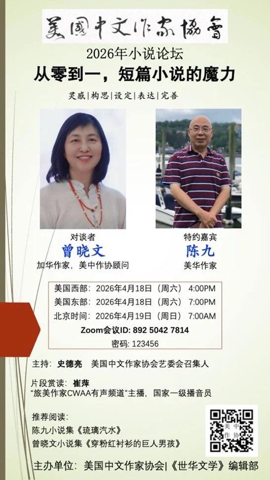 在跨文化经验与现实生活的交汇处,写作既是个人经验的沉淀,也是对时代与人性的回应。两位长期活跃于北美文学界的华文作家曾晓文女士与陈九先生,将围绕“从零到一:短篇小说的魔力”,展开一场关于创作本质的深度对谈。